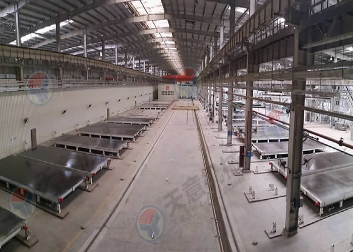 該生產線采用移動模臺加中央擺渡車的形式來生產構件,比起固定模臺來更加靈活,效率更高,澆筑振搗完的的構件由中央擺渡車將模臺送入養(yǎng)護窯養(yǎng)護,布局合理,工藝先進,可同時生產多種混凝土預制構件。